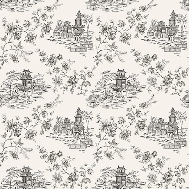 This oriental toile wallpaper is featured in tones of gray on a crisp white backing.