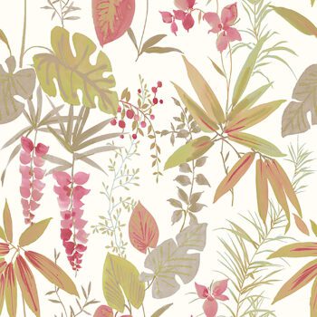 This wallpaper is of various foliage designs in tones of pink and green on a white backing.