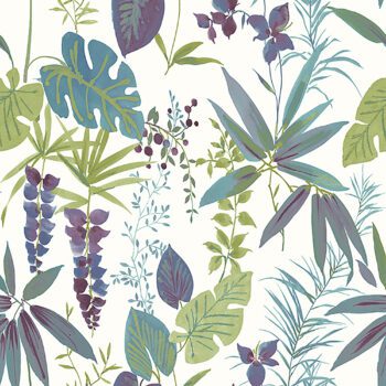 This wallpaper is of various foliage designs in tones of blue, purple, and gray on a white backing.