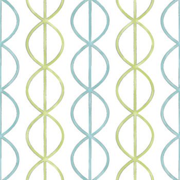 A chainlink design wallpaper with a contemporary flair. In hues of light teal blue and lime on an ivory ground.