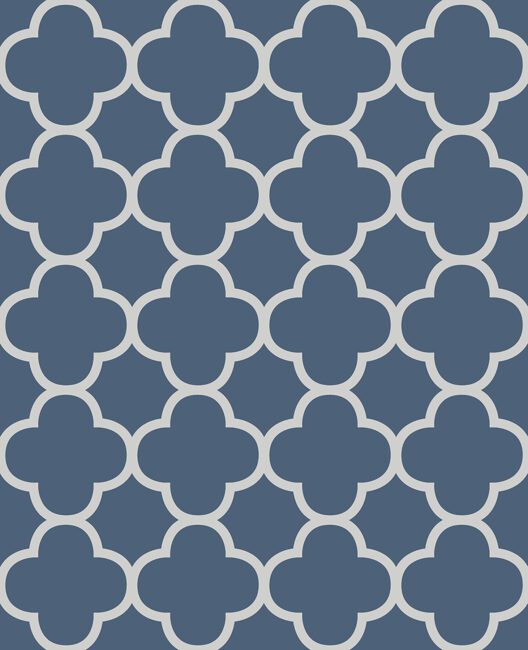 A contemporary quatrefoil design wallpaper. Silver foil design on a marine blue background.