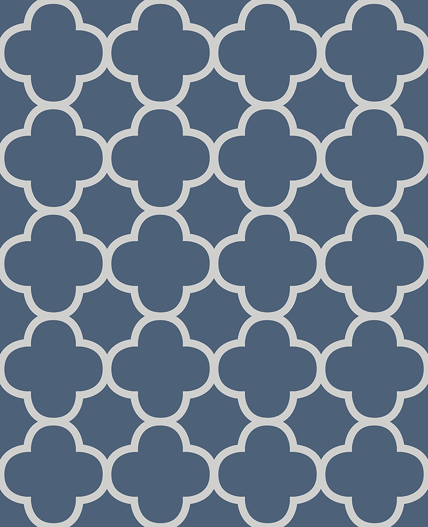 A contemporary quatrefoil design wallpaper. Silver foil design on a marine blue background.