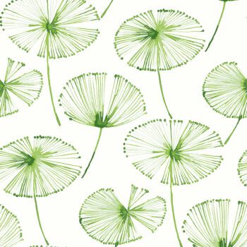 A floating abstract dandelion design wallpaper with a contemporary flair. In hues of kelly green on an ivory ground.