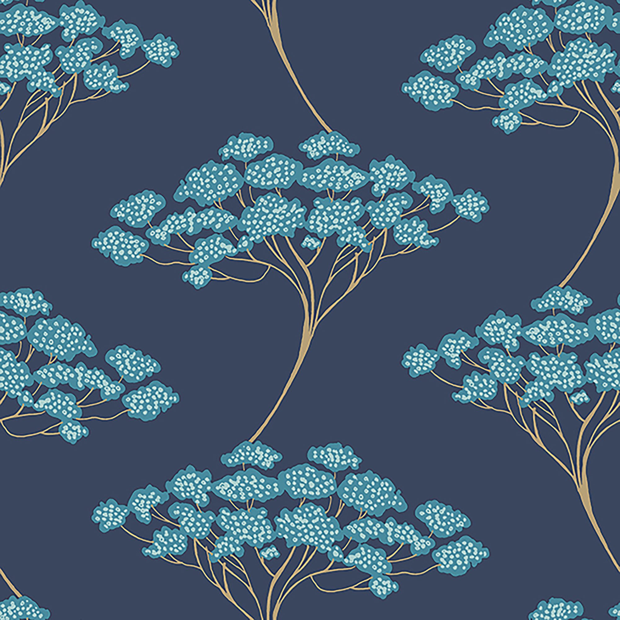 This worldly tree wallpaper has a luxurious style with a gold pearlescent trunks and teal leaves. Light blue buds add a floral touch. The navy background makes this design pop with the deep jewel tone.