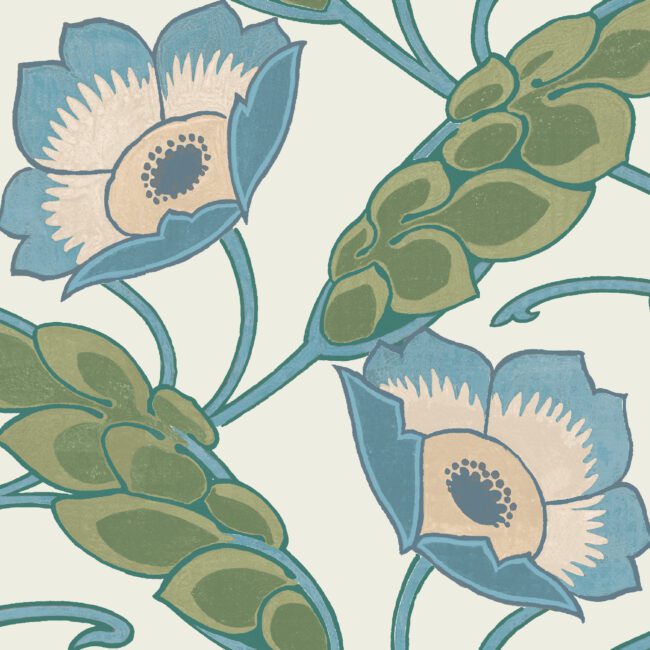 A large scale retro floral patterned wallcovering in tones of cream, green, blue, teal, and blush pink.