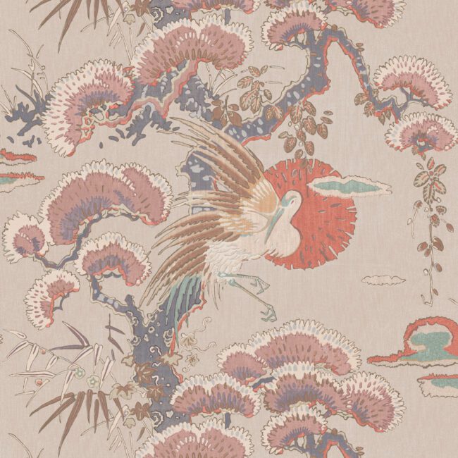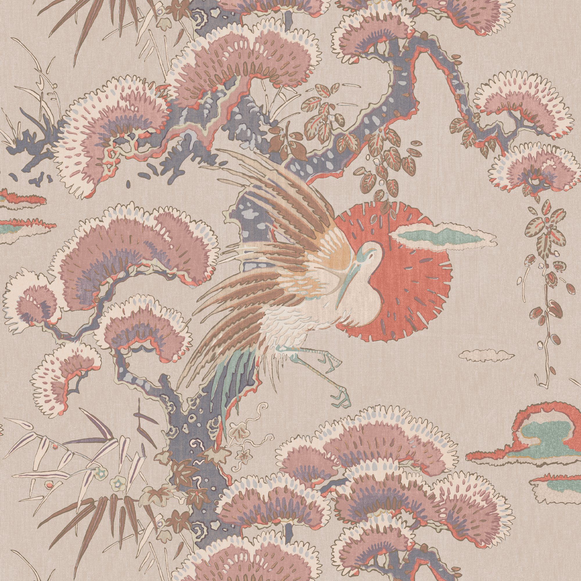 A traditional chinoiserie wallcovering depicting colorful cranes and greenery on a pearlescent gold background. Features a multitude of colors including shades of pink, coral, seafoam, taupe, mauve, sand and gold.