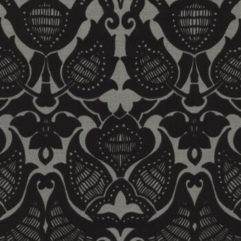 Stunning black flocked damask wallpaper on a shimmering silver metallic ground.