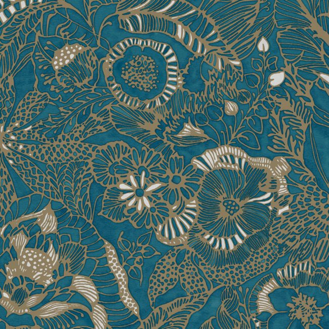 Opulent floral design wallpaper in a turquoise and gold coloration.