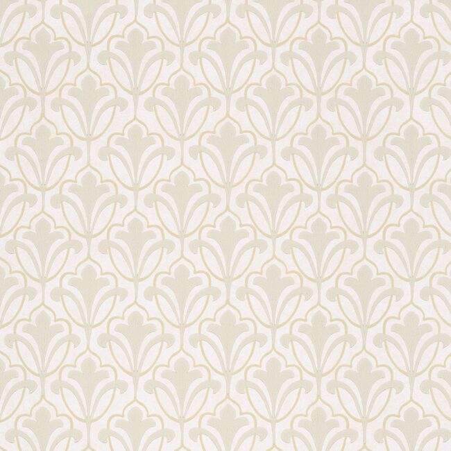 Ornamental floral design wallpaper. In hues of cream, beige and gold.