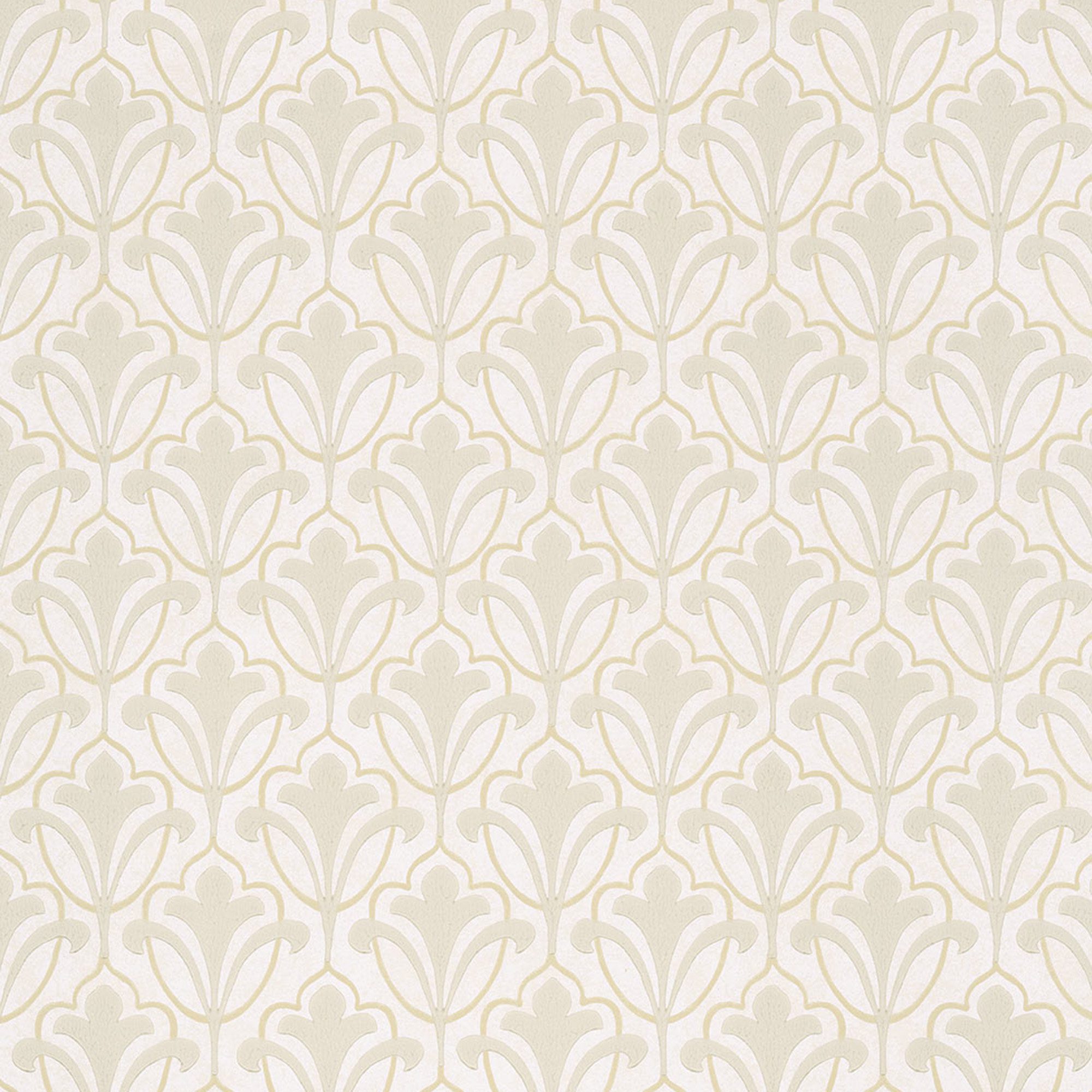 Ornamental floral design wallpaper. In hues of cream, beige and gold.