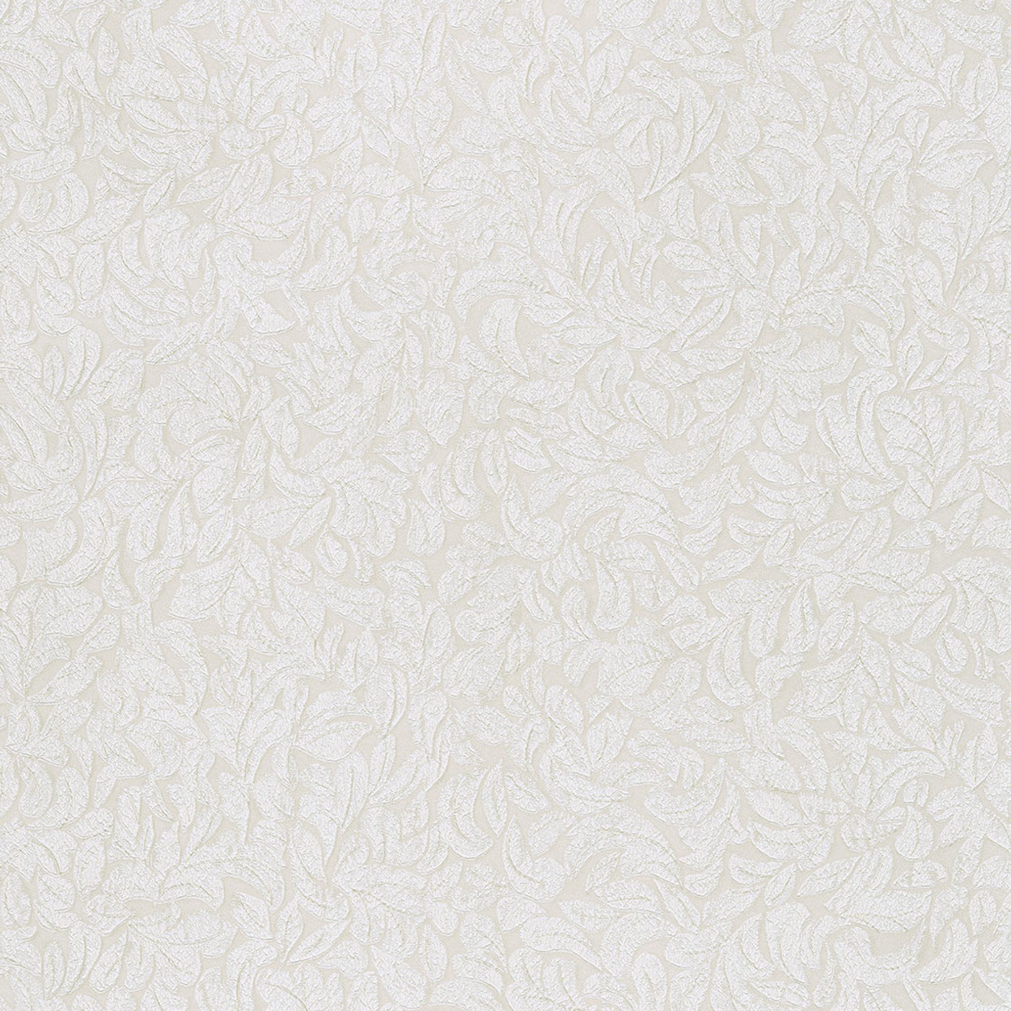 An embossed leaf design wallpaper. In a metallic cream on a beige ground coloration.