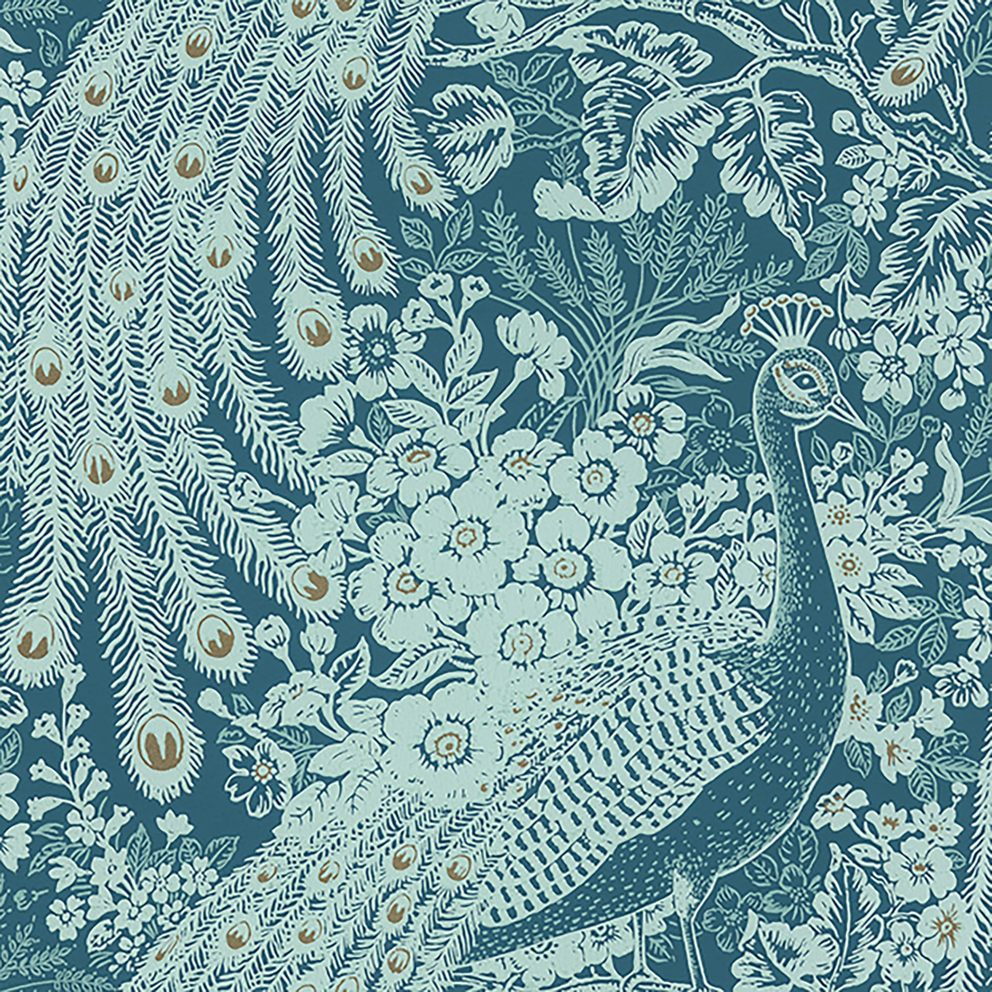 This wallpaper features a whimsical floral and peacock design in a gold and spa green on a teal background.
