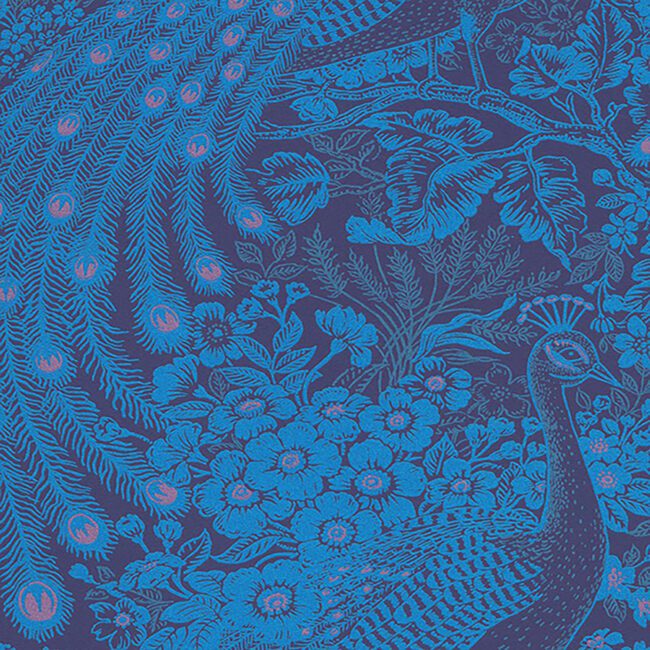 This wallpaper features a whimsical floral and peacock design in a metallic pink and metallic blue on a navy background.