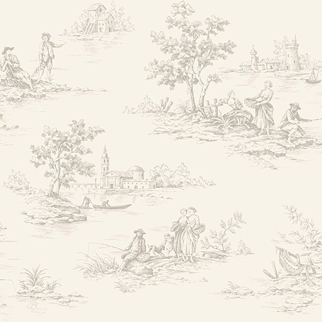 An intricate toile motif wallpaper featuring all the beauty of the countryside. Dove gray print on an cream background.