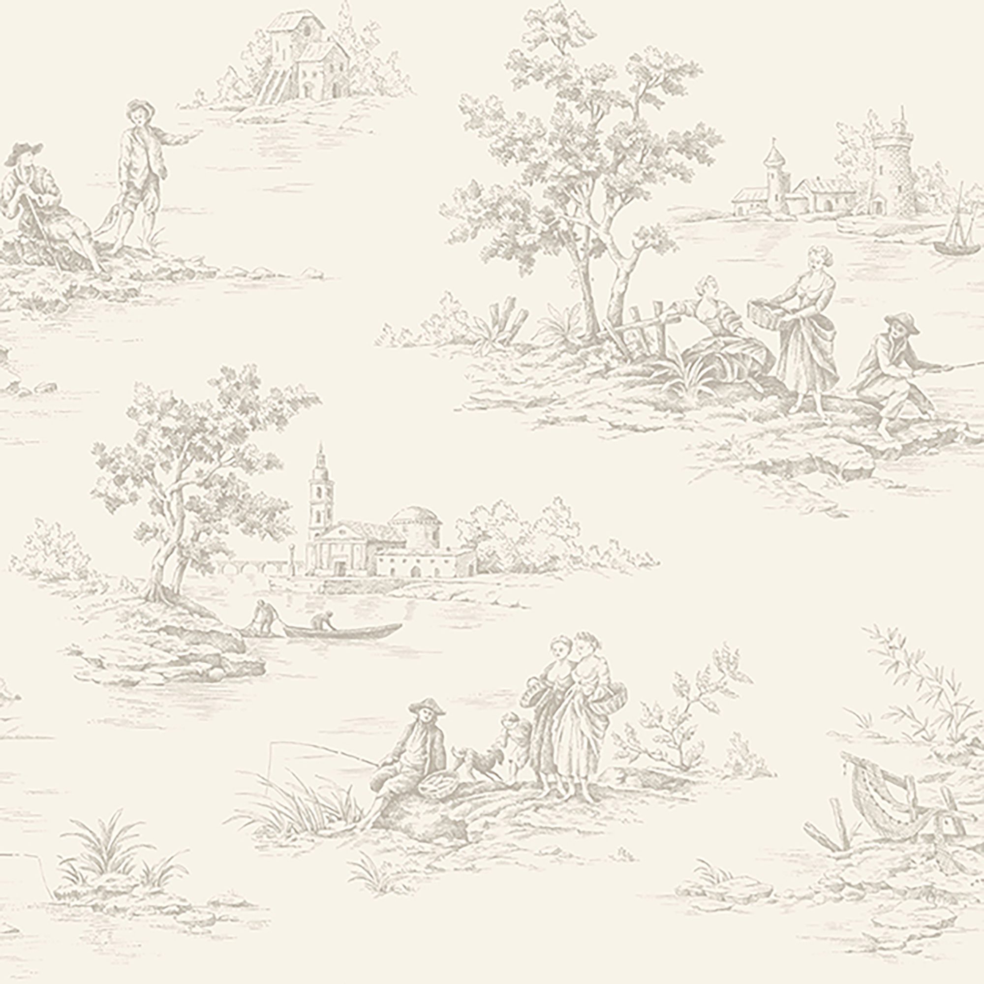 An intricate toile motif wallpaper featuring all the beauty of the countryside. Dove gray print on an cream background.