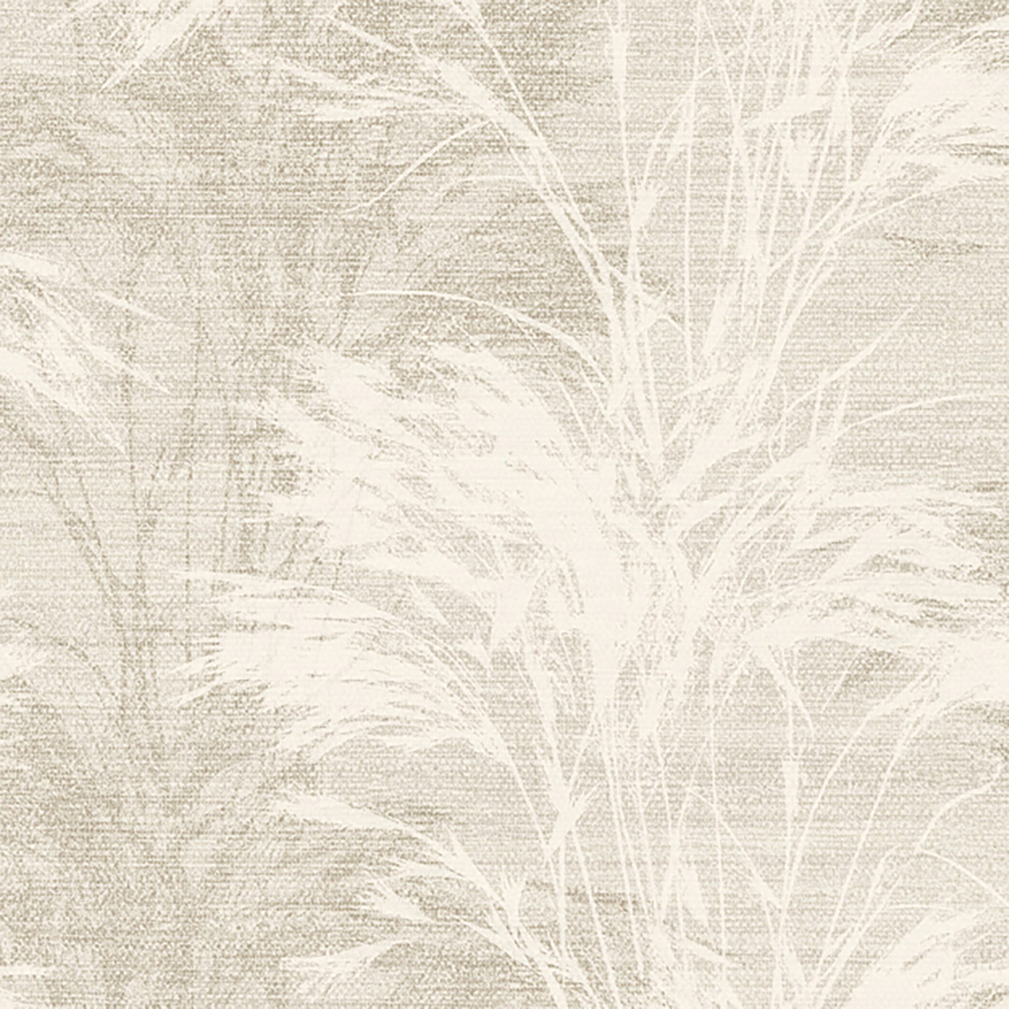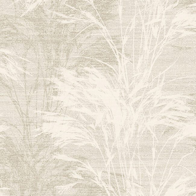 Swaying stems of tall grass on a faux grasscloth ground wallpaper is done in serene shades of cream with shimmering metallic that create a calming effect.?