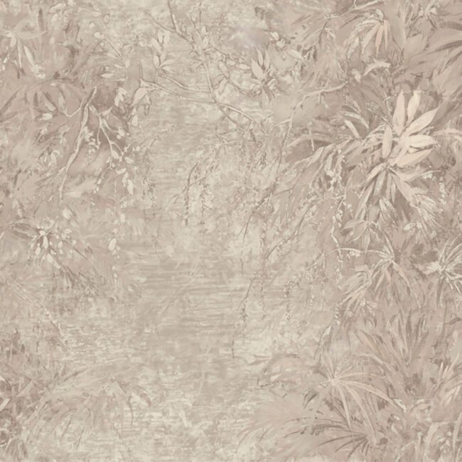 This textured vinyl wallpaper features an abstract leaf pattern in tones of warm copper browns.