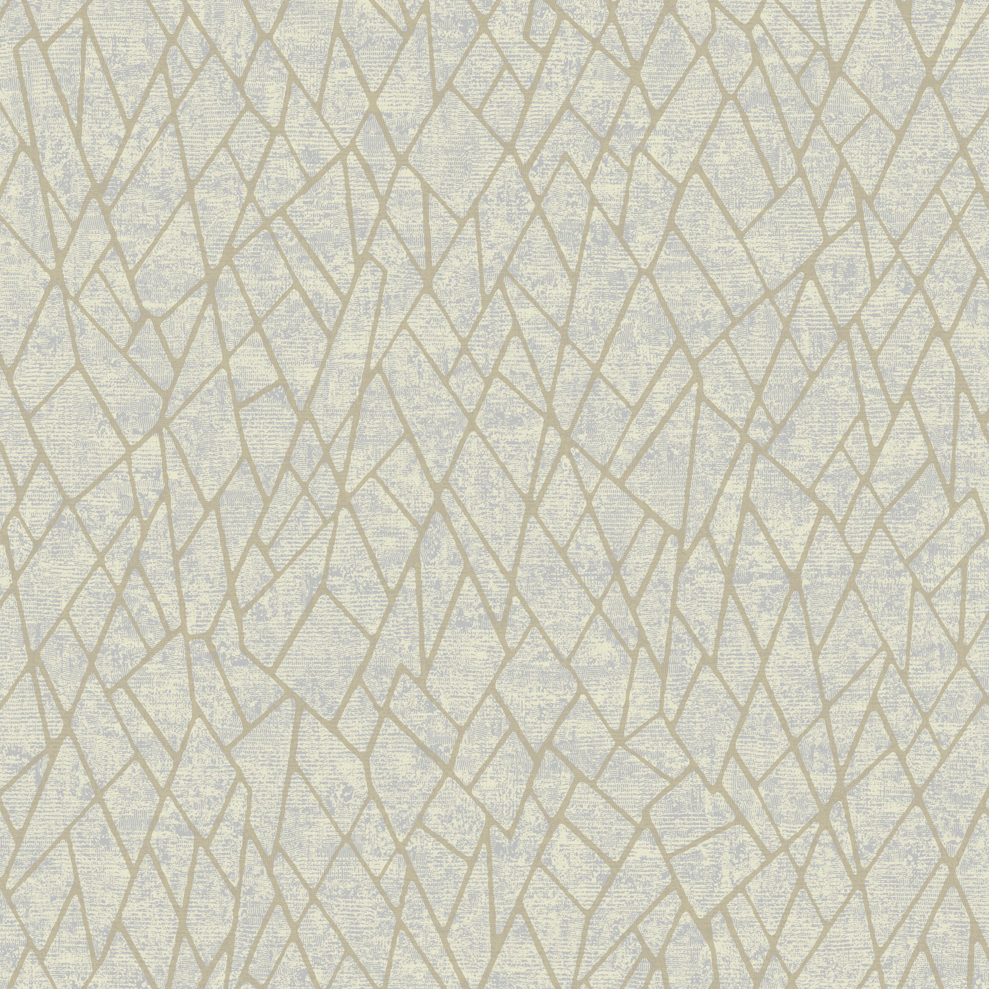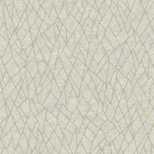 A stunning beaded wallpaper with a crackled geo design on a metallic ground. In a soft gray blue and gold coloration.