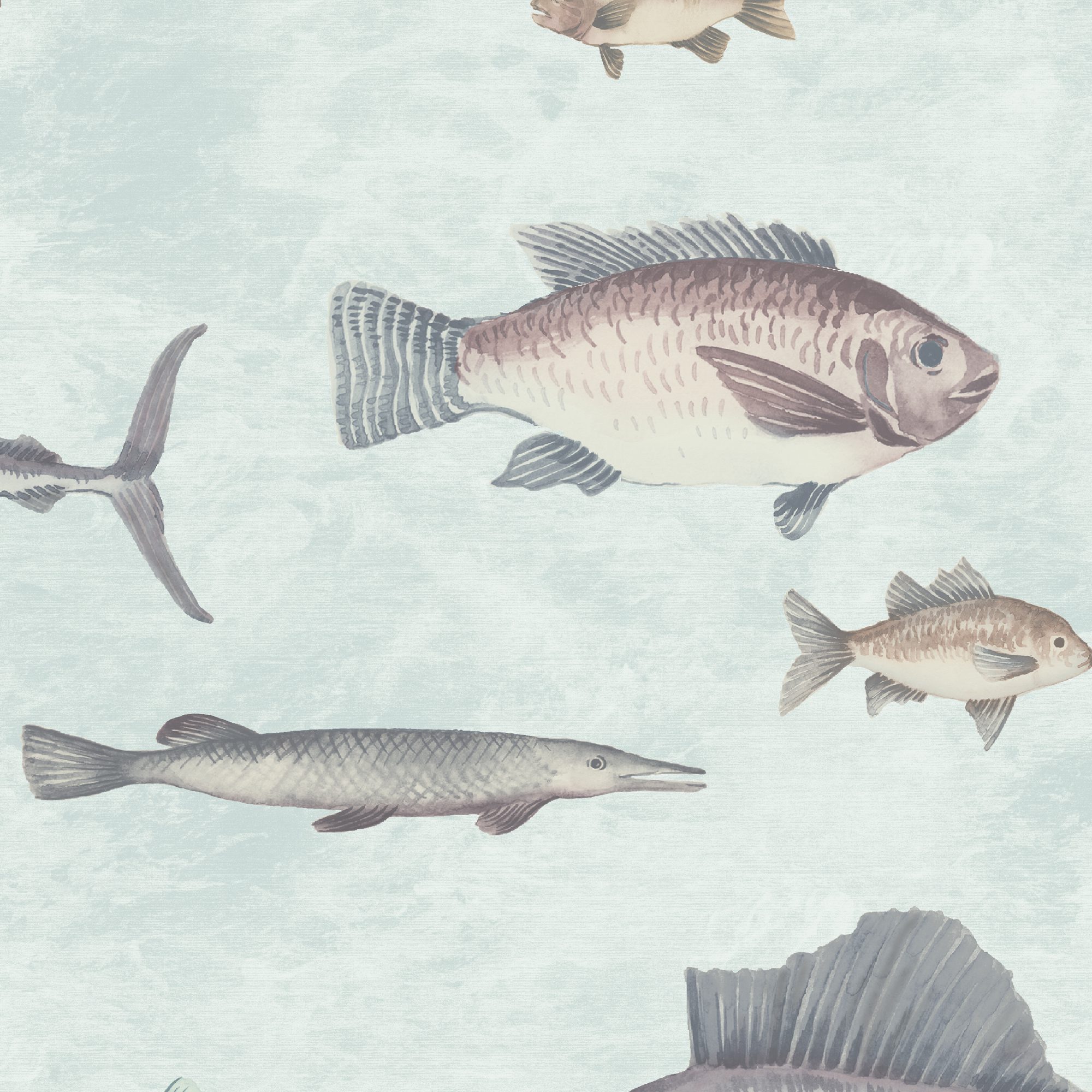 Turn your wall into an aquarium with this whimsy yet sophisticated aquatic printed watercolor wallpaper. With a marbled aqua background, this pattern features multiple life-size river fish in tones of taupe, beige, mauve and grey.