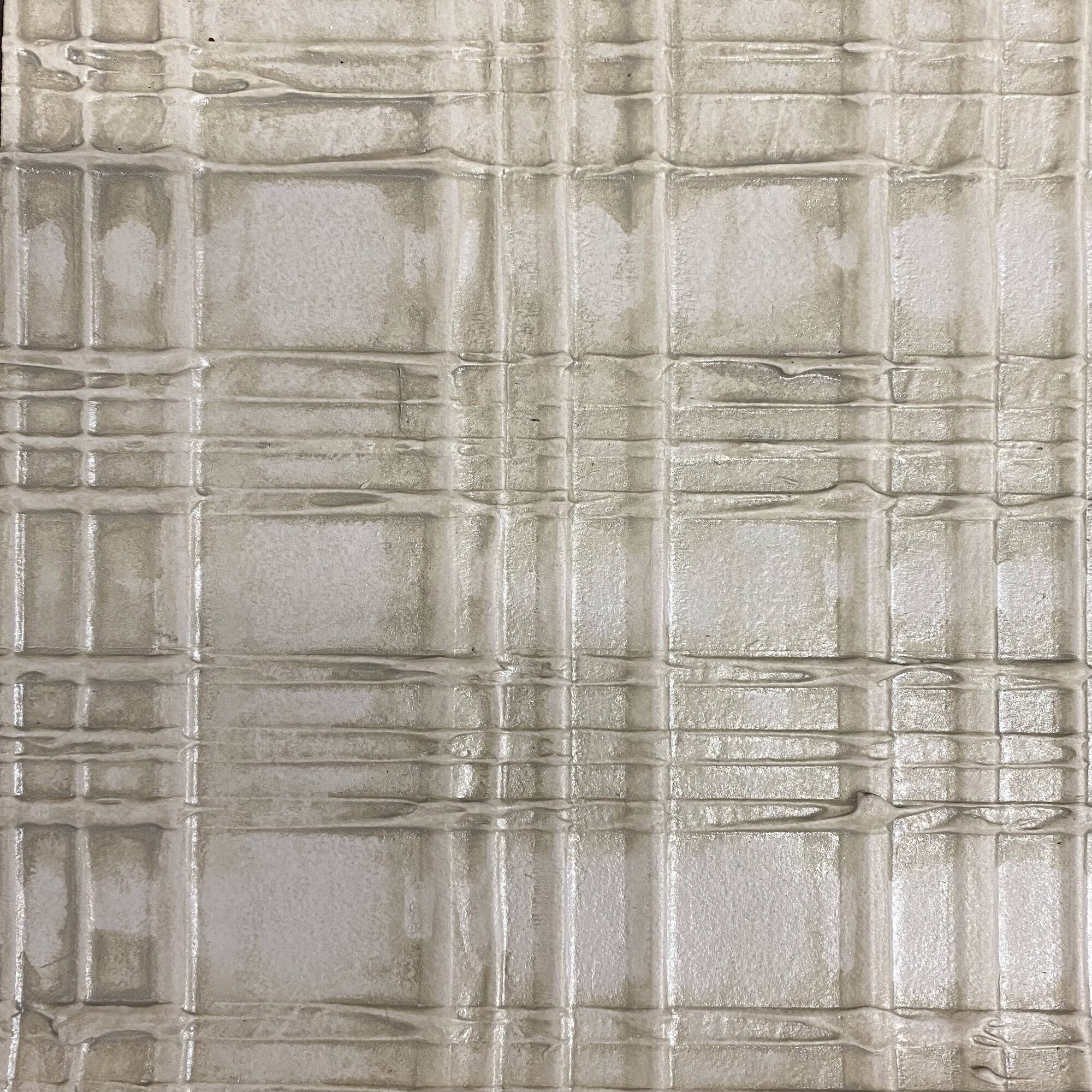 A tonal wallcovering embossed with all-over check texture, grey and white coloration. Hand crafted by artisans, no two rolls are alike and intricacies between these are part of the inherent beauty of the wallcovering.
